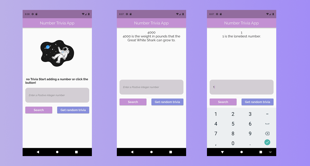 Number Trivia Application" user-friendly mobile app built with Flutter and developed with clean architecture and Test-driven development. This app allows users to explore fascinating trivia associated with numbers. Simply input a number of your choice, and the app will seamlessly fetch intriguing trivia related to that specific number from an external API. Also Users can get random number trivia by just clicking on the button Whether you're interested in historical facts, mathematical curiosities, or any other trivia, this app has you covered. Click here to view the source code.